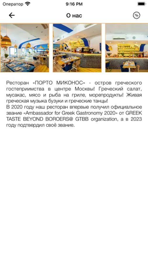 Таверна «ПОРТО МИКОНОС» - остров греческого гостеприимства в центре Москвы! С 2016 года она открыла двери и делает все, чтобы в гости наслаждались аутентичной греческой кухней, заряжались теплом и улыбками! Ведь согласно греческим традициям Гость - посланник Бога, и ему отдается всё самое лучшее!