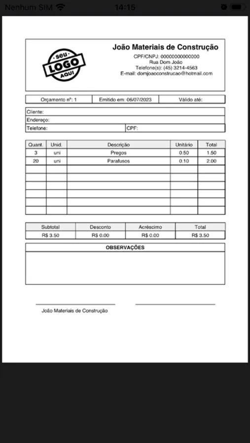1- Crie um cabeçalho com a logo da empresa e os seus dados. (você precisará fazer essa etapa apenas uma vez, seu cabeçalho ficará salvo para utilizar em outros orçamentos)