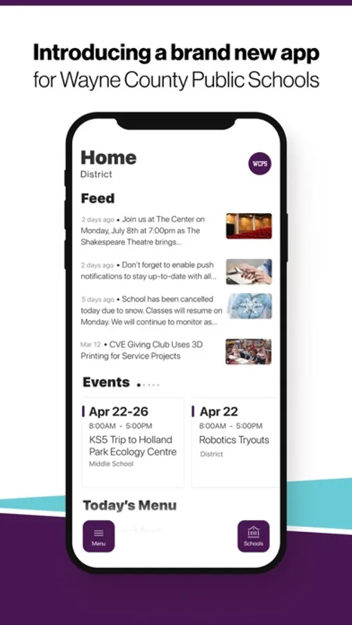The event section shows a list of events throughout the district. Users can add an event to their calendar to share the event with friends and family with one tap.