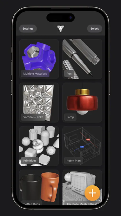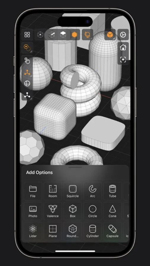 • 25 primitive shapes are built-in & ready to help you start modeling: plane, box, sphere, squircle, rounded box, arc, circle, cylinder, tube, cone, capsule, torus, icosphere, pipe, revolve, helix, voronoi, text, super shape, noise surfaces, torus knot, faceted gem & tube.