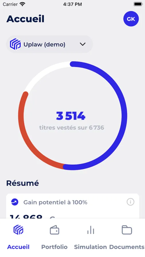Avec des fonctionnalités intuitives et une interface conviviale, l'application permet aux utilisateurs de suivre l'intégralité de leurs vestings , de traquer les chiffres clés, de simuler les gains potentiels en fonction de la valorisation de l'entreprise et du prix par action, d'accéder à des documents importants, et de gérer les informations de leur profil. Uplaw wallet est l'outil ultime pour rester informé et prendre des décisions éclairées sur l’ensemble de votre portefeuille.