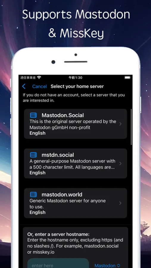 This app isn't affiliated with Mastodon, MissKey, or BlueSky. It's a third-party client compatible with these platforms.