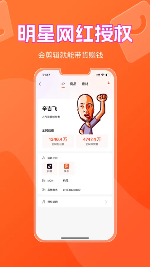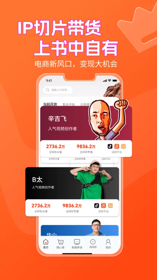 人人都可以借助IP的内容流量,选择有保障的商品,安心带货赚钱。抖音、快手、视频号,短视频、直播带货,满足多平台多形式变现需求。
