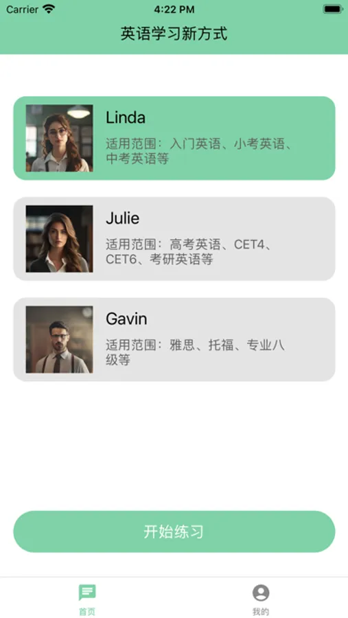 我们的应用程序还提供了一系列英语教师,以满足你的需求。无论你是初学者还是高级学习者,我们都有Linda适合初学者、Julie适合中级学习者和Gavin适合高级学习者。通过我们创新的基于对话的方法,你将很快像本地人一样讲英语。