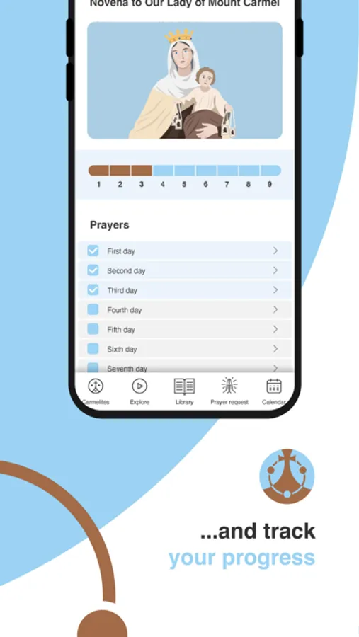 - You will have a daily prayer text and will be able to track the days you have completed and see your progress in each Novena.