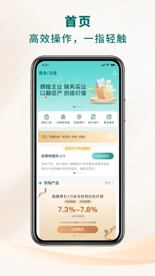 英大财富管理app致力于为高净值客户提供安全便捷的线上财富管理平台,为客户提供产品查询及在线预约、远程双录、电子签约、个人资产查询,查看信息披露等服务。