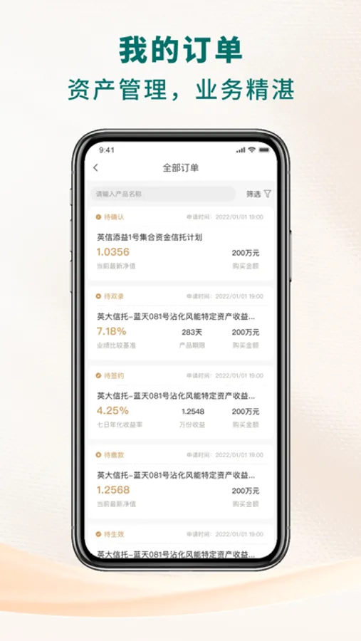 3、个人资产查询:查询您存续及已清算的信托资产信息,合同信息及收益分配明细,产品信息披露报告等;