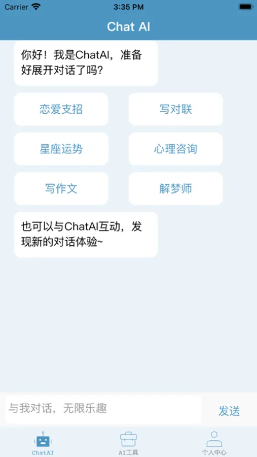 欢迎使用ChatAI!我们将为您带来前所未有的智能对话体验。ChatAI是一款基于人工智能技术的聊天机器人,具备以下特点: