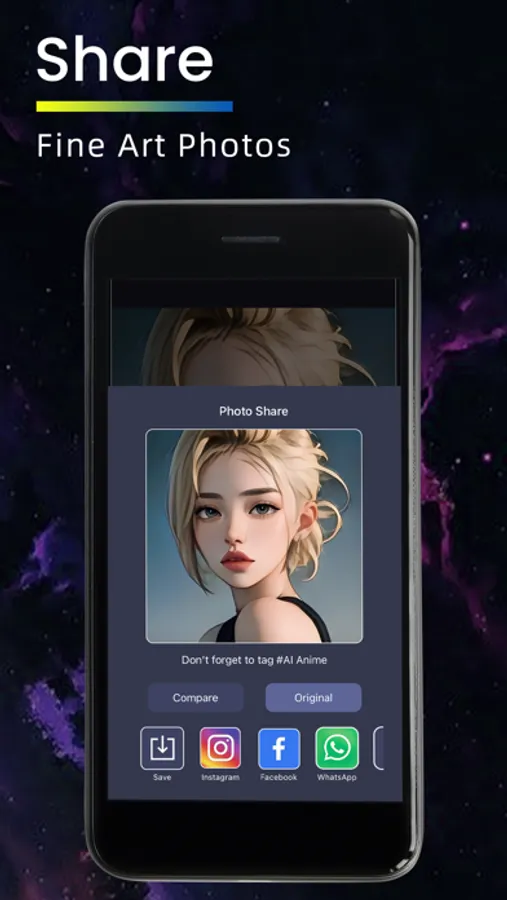 2. Seamless Sharing: Share your anime creations with friends and fans of anime across various platforms! Effortlessly share your transformed images to popular third-party apps and social media platforms, spreading the joy of anime with just a click.