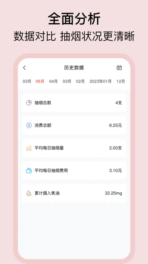 【抽烟报告】:根据您的抽烟情况生成专属戒烟抽烟报告,包括抽烟消费金额、焦油统计等,详细记录每天、每月、每年的抽烟信息。精确统计每支烟!