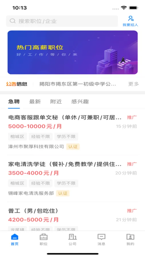 揭阳招聘、找工作,就看揭阳直聘! 揭阳直聘是揭阳无忧人力资源有限公司旗下招聘网站,致力于为求职者提供揭阳本地优质招聘信息、为企业提供招聘渠道,帮助每一个求职者在揭阳直聘找到合适的工作! 揭阳直聘,搜索好工作!