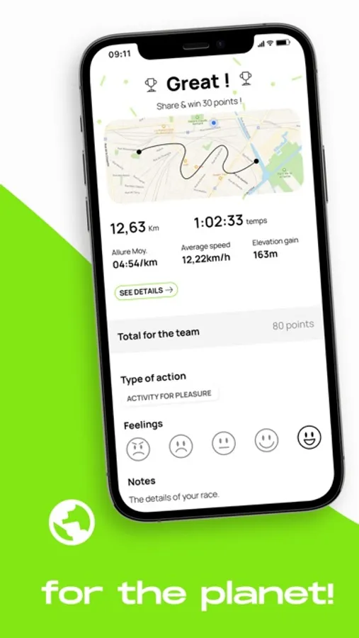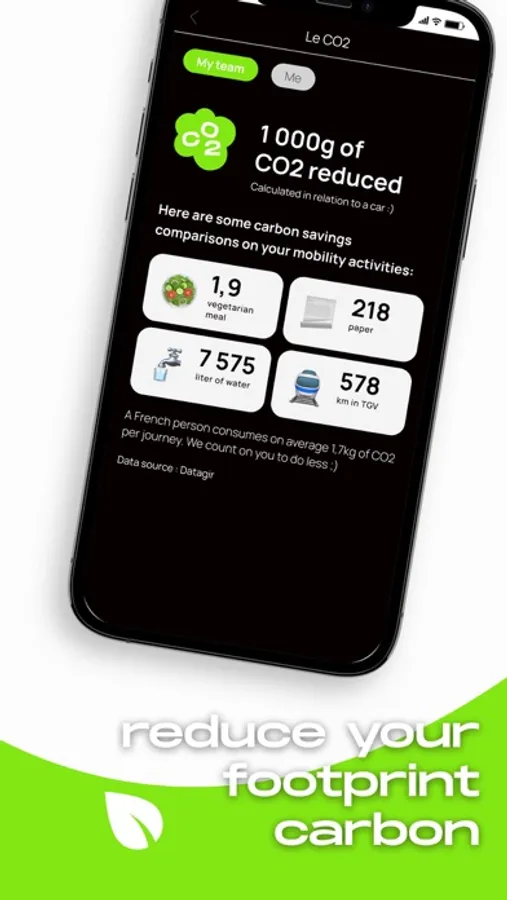 The app's user-friendly interface will allow you to easily navigate through the application. Quizzes, challenges, missions, and solidarity tasks are easily accessible from the homepage. The ""decarbonizer"" mode calculates the CO2 emission savings you achieve when you change your mode of transportation for your professional trips. You can exchange private or team messages with your colleagues to motivate each other. You will have access to statistics for all your activities. Finally, at any time, a global ranking will show your team's position.
