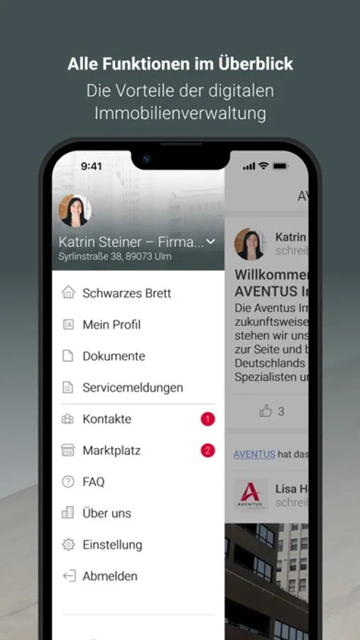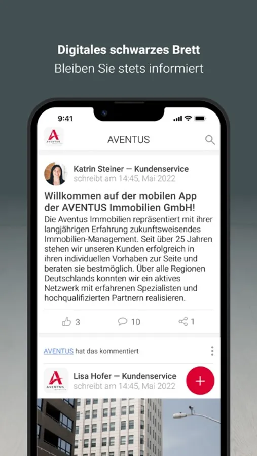- Schnelle und effiziente Kommunikation: In unserer AVENTUS Immo App finden Sie alle Informationen und Dokumentationen an einem Ort gebündelt – in Ihrer Hosentasche und jederzeit digital verfügbar