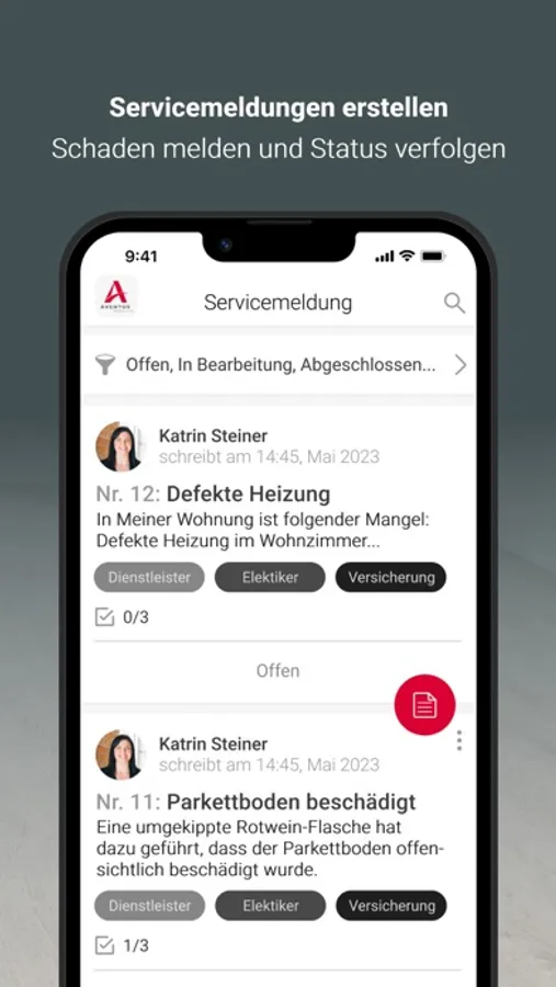 - Interaktiv: Sie können in der AVENTUS Immo App direkt Schadensmeldungen oder andere Anliegen mit Fotos erfassen. Ihr Sachverhalt wird schnell bearbeitet und Sie erhalten regelmäßige Status-Updates per Push-Nachrichten.