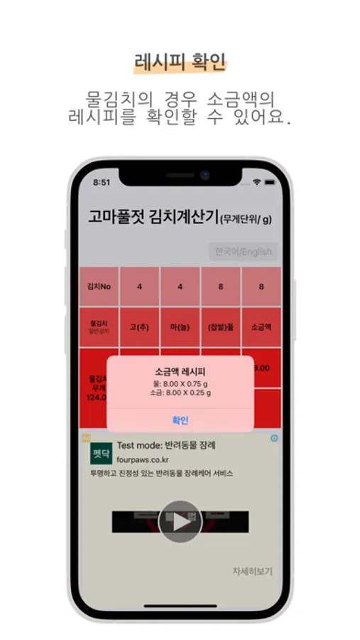 - Then, if you select and enter either the weight of kimchi or the remaining weight, the weight of **Re**(Red pepper powder), **Ga**(ground Galic), **Pa**(Paste), **Jeot**(Jeotgal) to be included in the kimchi is automatically calculated and displayed.