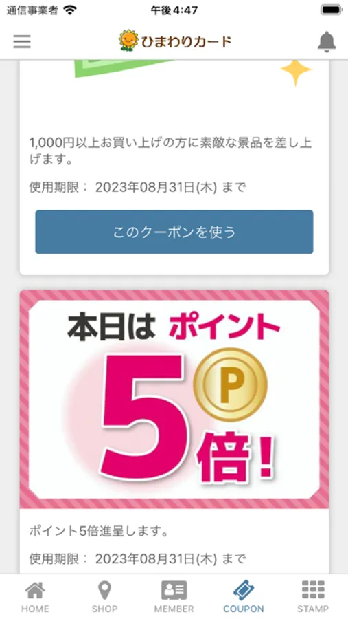 ◆ポイントカードとしてお財布にポイントカードを入れていなくても、アプリ画面のご提示でひまわりカードとしてご利用頂けます。ポイント残高も確認できます。