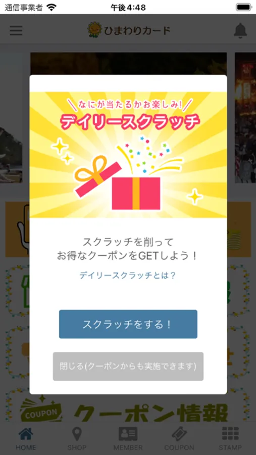 お店のお得なクーポンやデイリースクラッチ、スタンプラリーの機能が付いた公式アプリです。