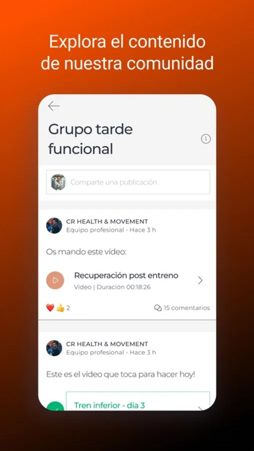 Únete a nuestra comunidad exclusiva para miembros, donde podrás compartir tus progresos, retos y motivaciones con otros miembros de CR Health&Movement.