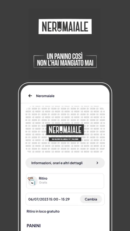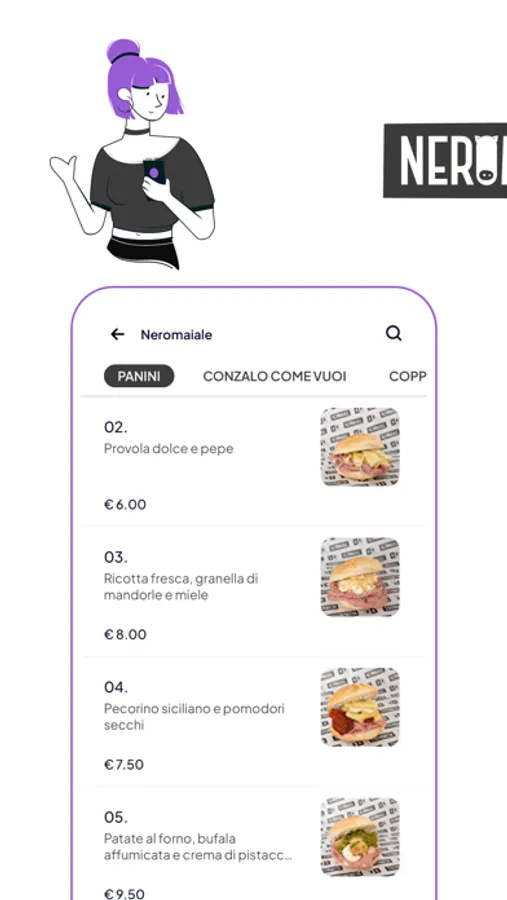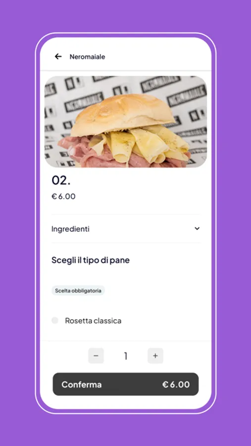 Con l'app Neromaiale potrai consultare il menu in qualsiasi momento per scoprire tutte le combinazioni di gusto proposte, senza dimenticare che puoi comporre il tuo panino dei sogni scegliendo ogni singolo ingrediente da aggiungere, tra formaggi freschi e stagionati, verdure cotte o crude, pesti, creme e granelle.