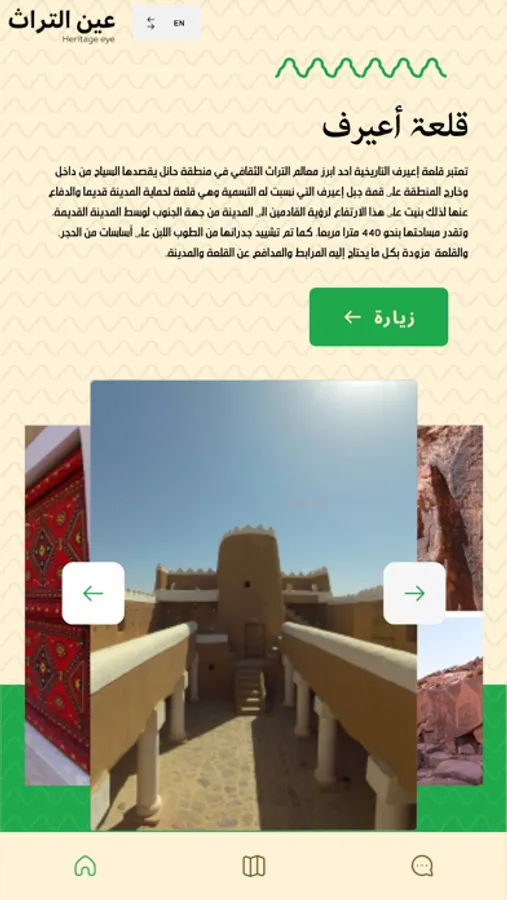 عين التراث تأخذكم في جولة عبر افتراضية بحُلّة مبتكرة وفريدة تواكب تطلُّعاتكم، وتحاكي مواقع التراث الثقافي وآفاقه التاريخية؛ للاحتفاء بالموروث الأصيل والتعريف به، وتسليط الضوء على قيمه الثمينة، وتعزيز الانتماء للهوية الوطنية، والتعرف على قصة الحضارة التي نسجتها أيدي الأجداد.