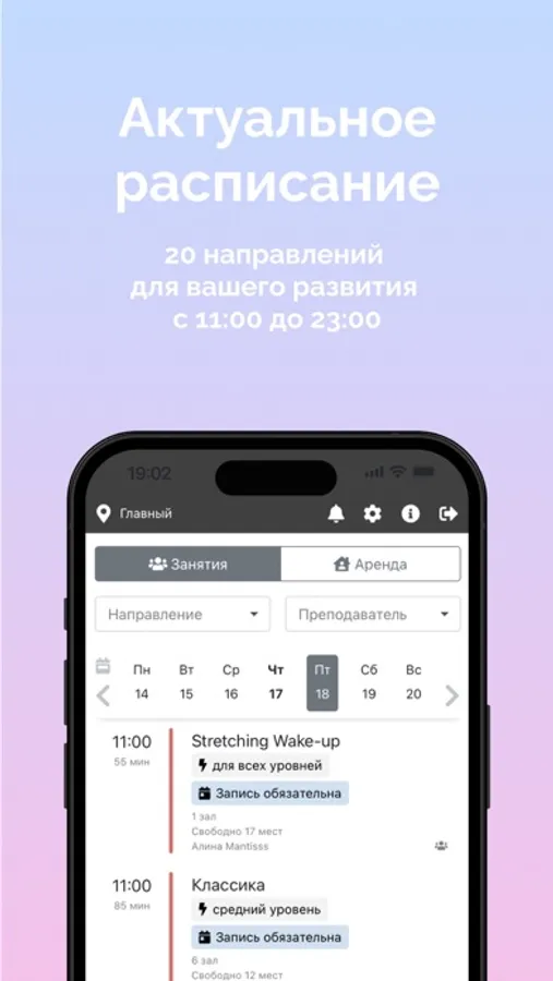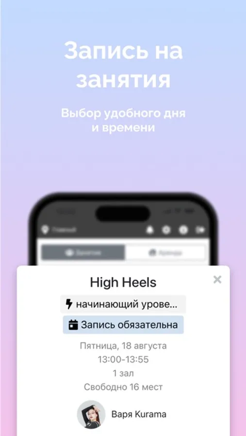 С помощью приложения вы сможете смотреть расписание, записываться на занятия, отслеживать действующий абонемент и свои посещения в S17.