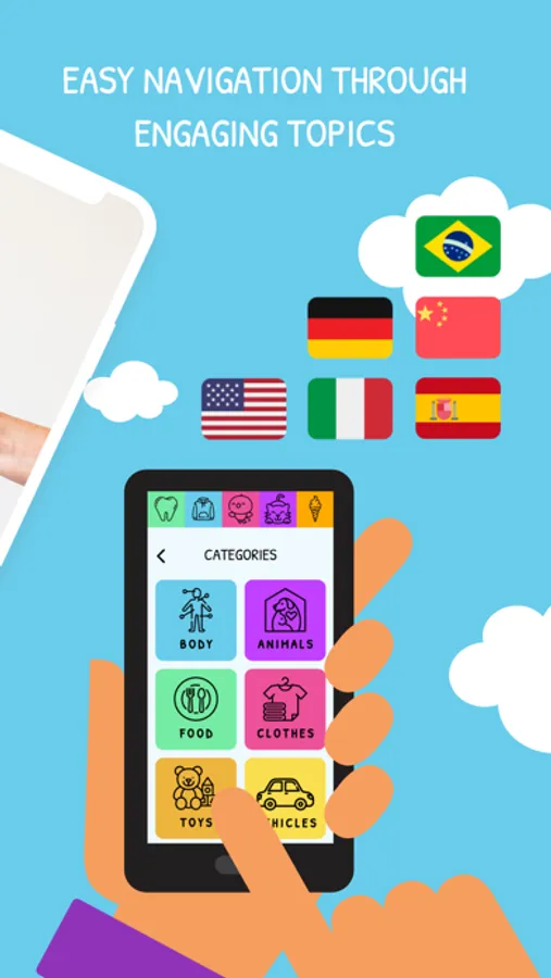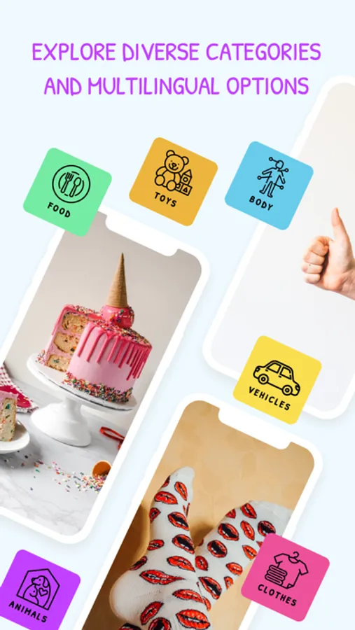 Discover 150 carefully chosen words across six lively categories - Food, Body, Vehicles, Toys, Clothes, and Animals. Each category presents an interactive learning environment that inspires curiosity, encourages language development, and enhances cognitive growth.