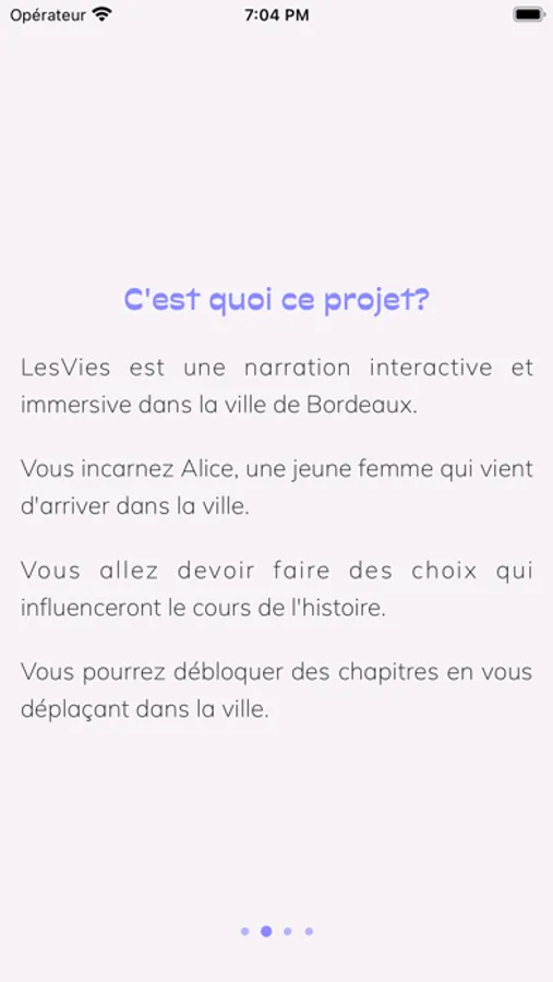 LesVies est une application narrative immersive à travers les rues de Bordeaux, vous devrez vous rendre à l'endroit où se déroule les chapitres afin de suivre le récit d'Alice.