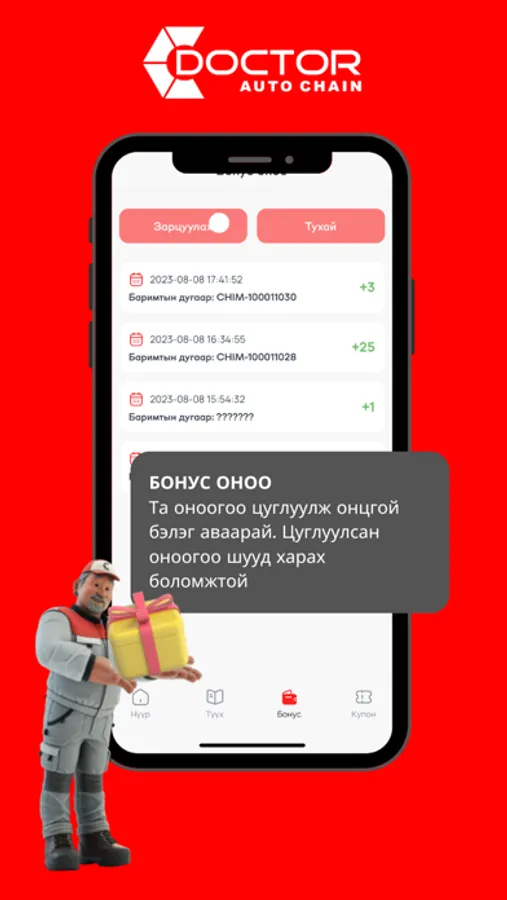 Доктор Авто Сүлжээ компаний харилцагчдад зориулсан апп. Та Доктор Апп-аар дамжуулан үйлчилгээ болон худалдан авалтын түүхээ харах, засвар үйлчилгээний цаг захиалах, бонус оноогоо хянах, мөн хямдралын купон хүлээн авах зэрэг таны автомашин дах амьдралыг аз жаргалтай байлгахад туслах цахим ертөнцөд нэвтрэх болно.
