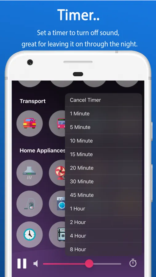 The app contains great selection of soothing white noise and lullabies. It has a simple timer that saves your battery.