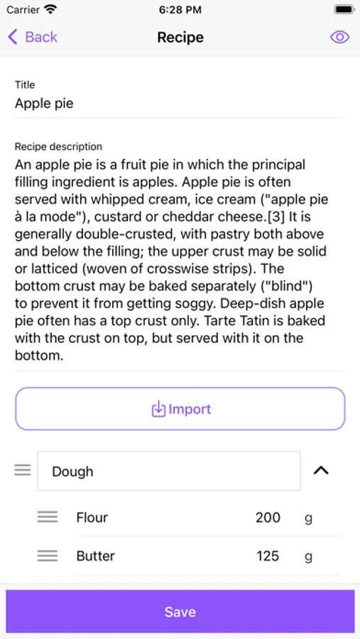 Additional feature is important recipes by text or photo, now you can simply take a picture from some recipes book, and app will important as recipes structure with all texts and measurements.