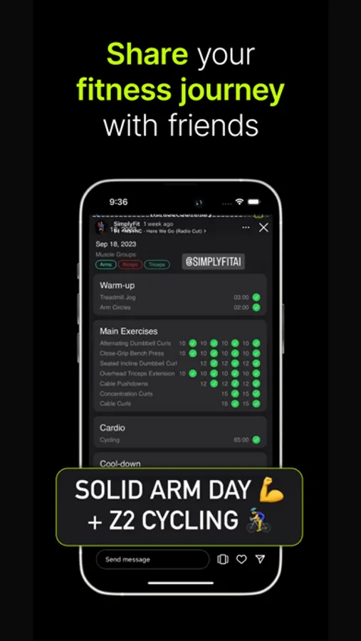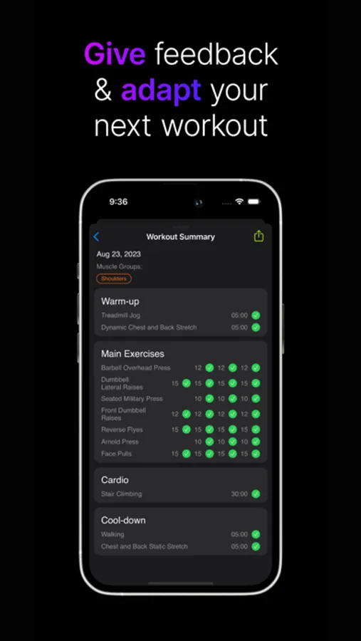 Keep track of your fitness journey with a summary of each session. Monitor your progress, view your achievements, and share your hard work with ease.