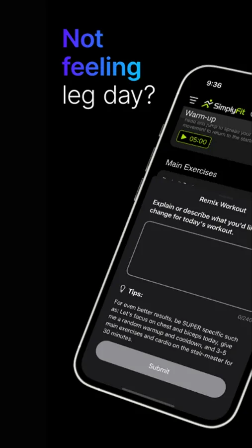 SimplyFit creates custom workouts tailored to your goals, preferences, fitness level, and more. Whether you're seasoned or just starting out, we've got you covered.