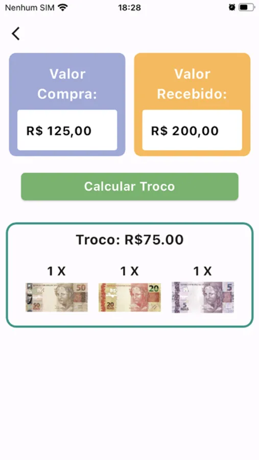 Aplicativo para ajudar pessoas com dificuldade de calcular o troco. Nele você insere o valor da compra, o valor recebido e então o aplicativo calcula as cédulas de dinheiro que você deve retornar ao cliente.
