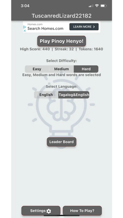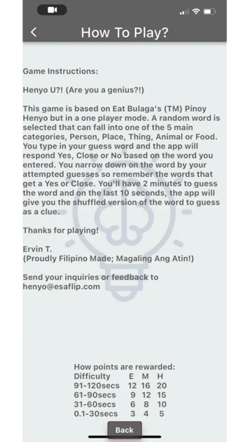 This game is based on a popular Filipino TV game show called Pinoy Henyo but in a one player mode. A random word is selected that fall's into one of the 5 main categories, Person, Place, Thing, Animal or Food. You type in your guess words and the app will respond "Yes, Close or No" based on the word you entered. You narrow down on the word by your attempted guesses so remember the words that gets a Yes or Close. You'll have 2 minutes to guess the word and on the last 10 seconds, the app will give you the shuffled version of the word to guess as a clue.