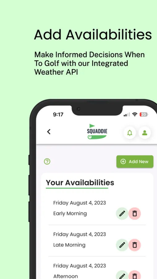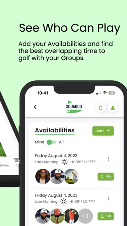 Helping golfers play more rounds with their golf groups by easily syncing availabilities and make sure every outing is with familiar faces. Goodbye annoying text groups and message boards and hello Squaddie!