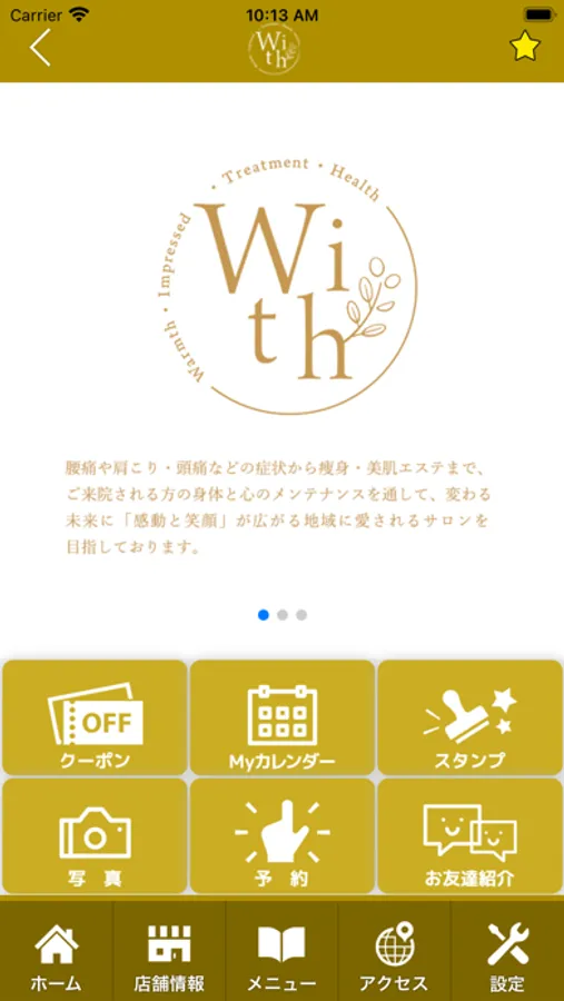 腰痛や肩こり・頭痛などの症状から痩身・美肌エステまで、ご来院される方の身体と心のメンテナンスを通して、変わる未来に【感動と笑顔】が広がる地域に愛されるサロンを目指しております。