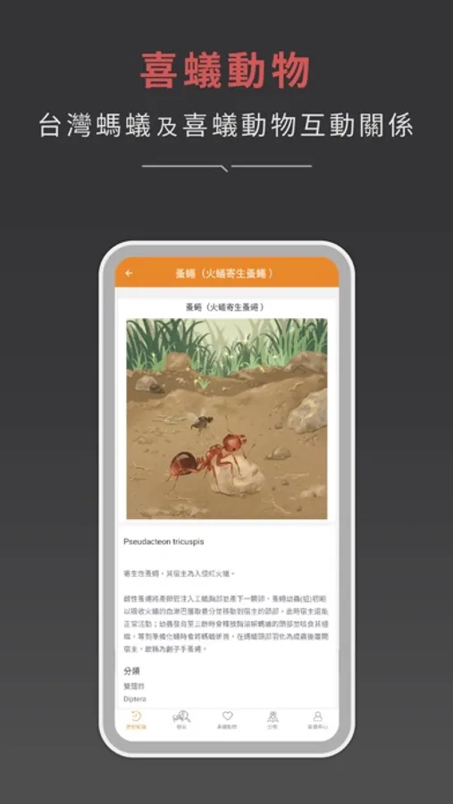觀察生活中的螞蟻,透過《AntFID 尋蟻覓跡》檢索系統簡易的分辨螞蟻特徵,系統會幫助你篩選出最相似的螞蟻種類,並紀錄所有檢索過程,你還能上傳自己的螞蟻,共同爲台灣建立一套台灣螞蟻地圖。並在《AntFID 尋蟻覓跡》中觀看生動有趣的喜蟻動物AR互動式動畫,了解螞蟻與他們的朋友之間獨特的互動行為。