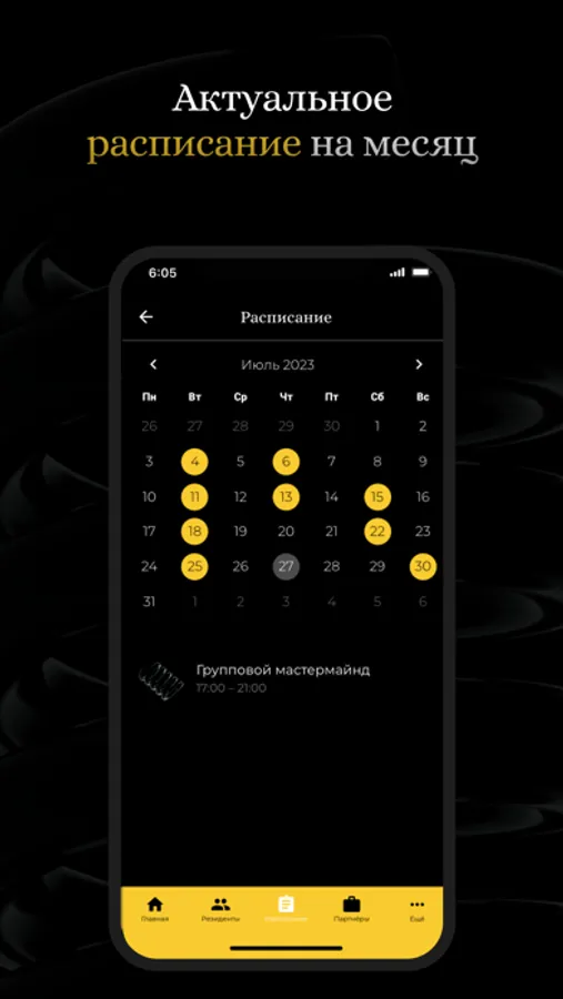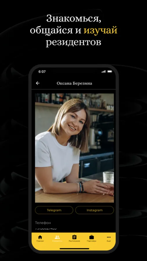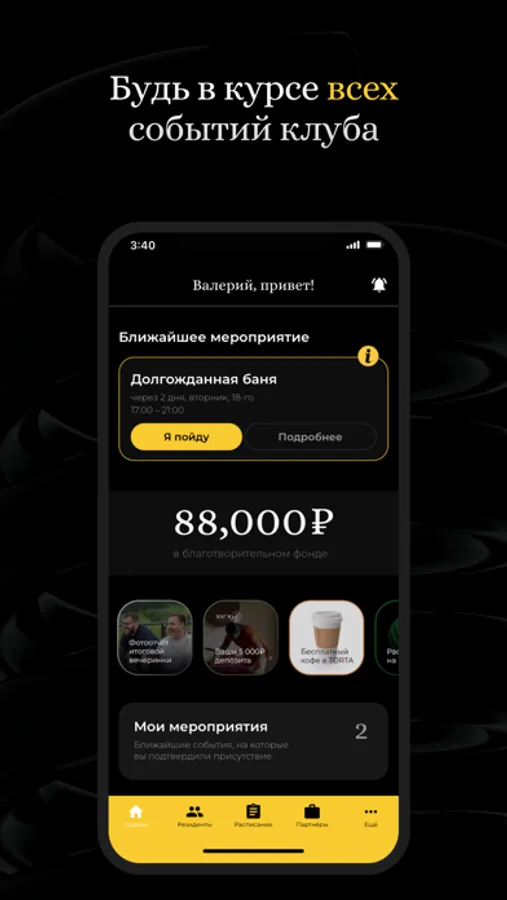 Мы разработали приложение, чтобы вам было максимально комфортно отслеживать все события, активности, новости и новых резидентов клуба.