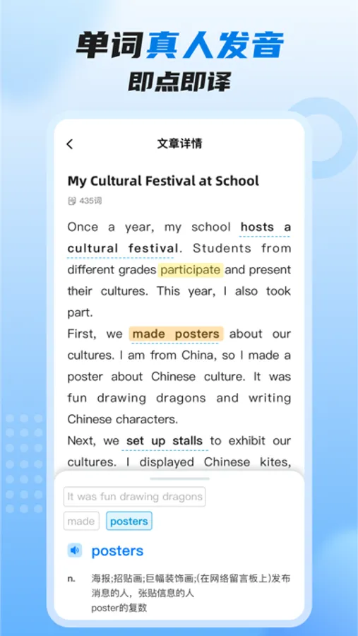 每个单词和短语都配有即点即译功能,你只需一键就能听到精准的单词发音。
