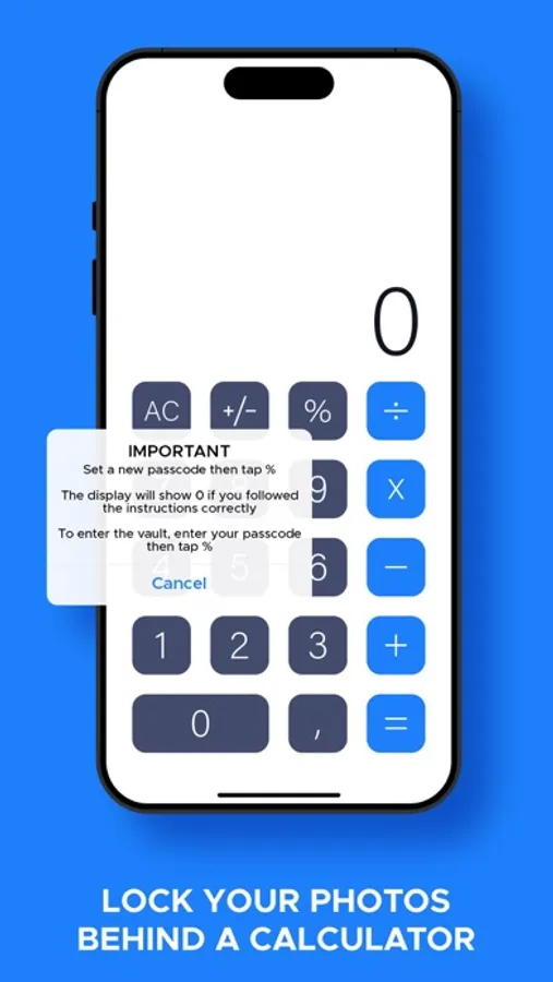 Setting up a secure passcode is simple and straightforward. By pressing any button followed by the "%" button, you can easily establish a unique and personalized passcode that only you will know. The app will confirm your successful input by displaying "0" on the screen.