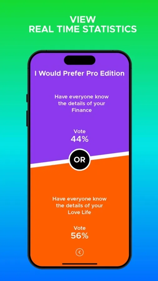 "I Would Prefer Pro Edition" offers a vast collection of carefully crafted questions across various categories, ensuring there's something for everyone. Whether you're pondering between two flavors of ice cream, vacation destinations, movie genres, or even hypothetical scenarios, this app will keep you engaged and entertained for hours.