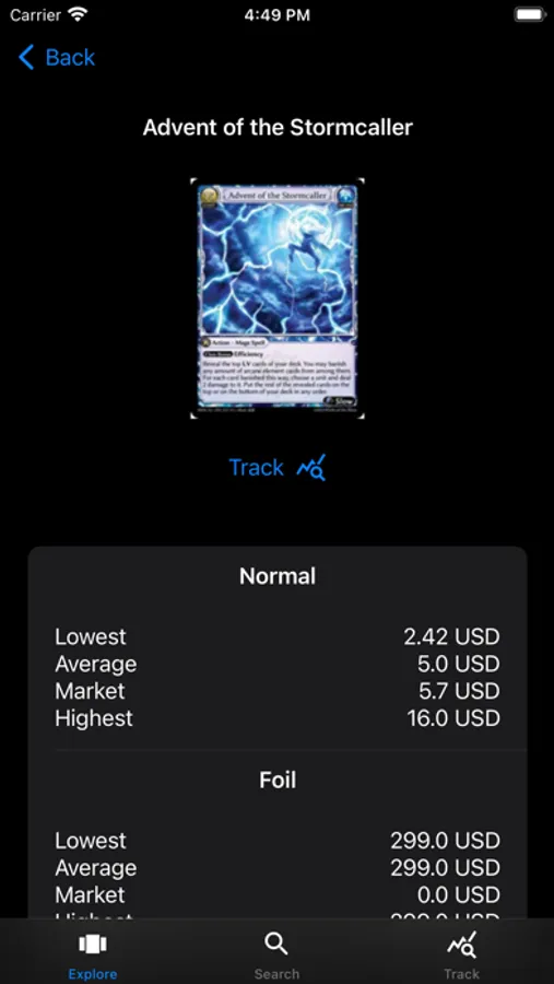 - Prices are displayed based on card variations such as Normal, Foil, etc.