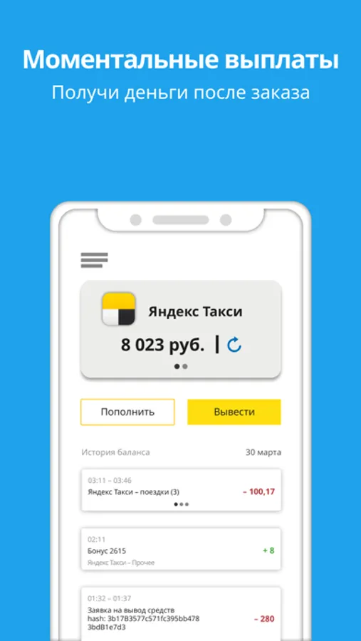 Таксопарк СТИХИЯ ежедневно создает комфортные условия для водителей такси и курьеров. Наше приложение для водителей Яндекс.Такси, Uber такси и курьеров является простым и понятным для наших клиентов, а вывод осуществляется моментально, без запроса менеджеру Яндекс.ПРО и ожидания расчётного периода в любой день недели. Скачиваете приложение, регистрируетесь в Яндекс.ПРО и выводите денежные средства уже после первого заказа.