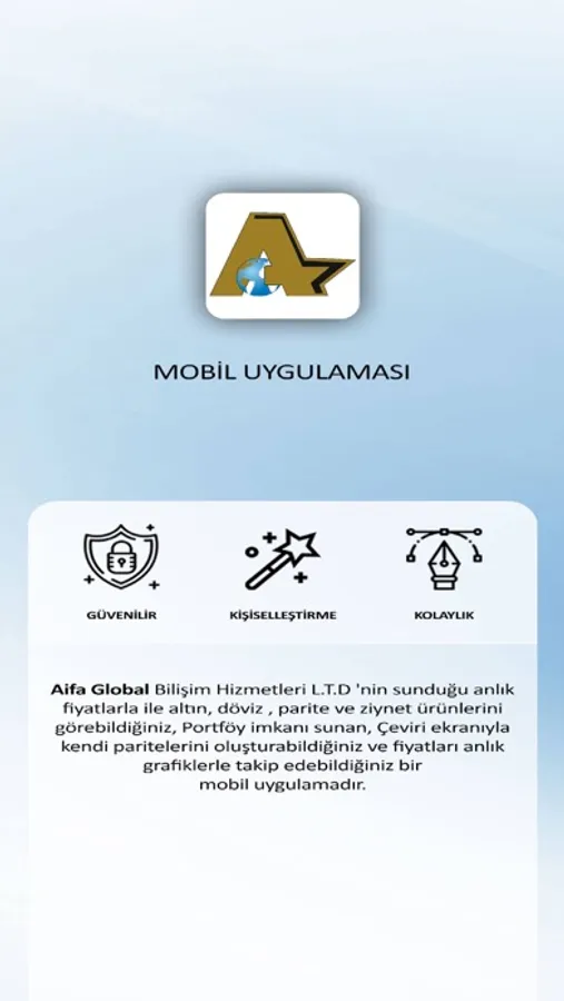Aifa Global Bilişim Hizmetleri L.T.D 'nin sunduğu anlık fiyatlarla ile altın, döviz , parite ve ziynet ürünlerini görebildiğiniz , Portföy imkanı sunan, Çeviri ekranıyla kendi paritelerini oluşturabildiğiniz ve fiyatları anlık grafiklerle takip edebildiğiniz bir mobil uygulamadır.