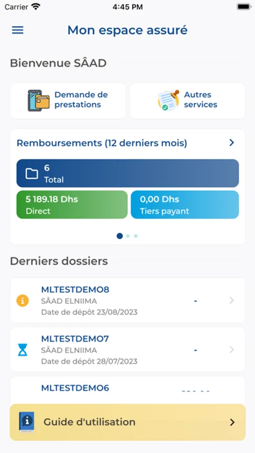 Un espace de demande de prestations : La dernière technologie a été mise à votre service (Les dernières technologies ont été mise en œuvre) pour (afin de vous permettre de) nous soumettre directement (l’ensemble de) vos demandes de prestations, (qu’elles soient relatives à la) conformité des dossiers de remboursement maladie et/ou dentaire, (des) demandes d’accords et de prise en charge, (une) déclaration d’ALD et (aux) compléments de dossiers. Les décisions et documents de réponse relatifs à vos demandes de prestations seront disponibles sur votre espace (personnel de) consultation CMIM Connect (dès leur disponibilité).