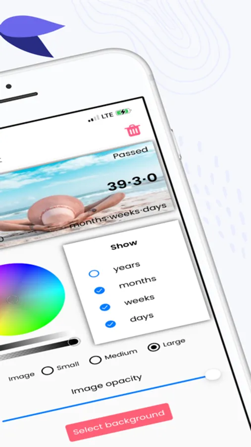Designed with a friendly, intuitive interface, DaysCo doesn't just allow you to count days; it also provides you with a canvas to personalize each counter to match your style. You can adjust the size and color, select an attractive background image, and perform a multitude of additional customizations that make each event stand out and be as unique as you are.