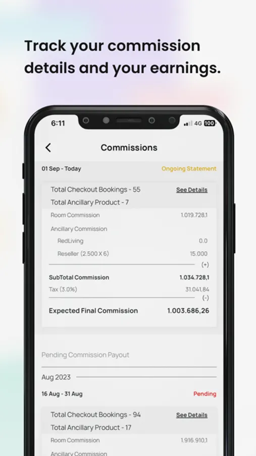 We make it easy for you to check all details of your earnings on the screen with adjustable sortings to your needs.