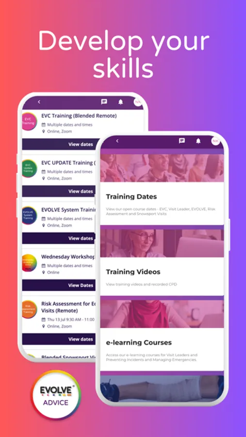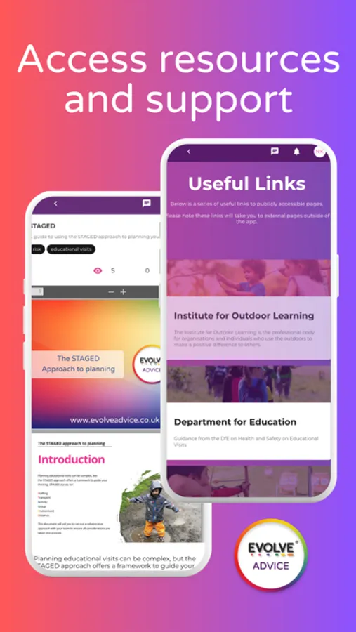 The EVOLVE Advice App provides Visit Leaders, EVCs and those involved in educational visits access to resources, publications, guidance, news, training courses and more.