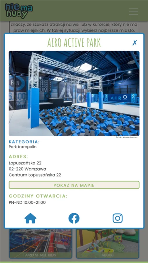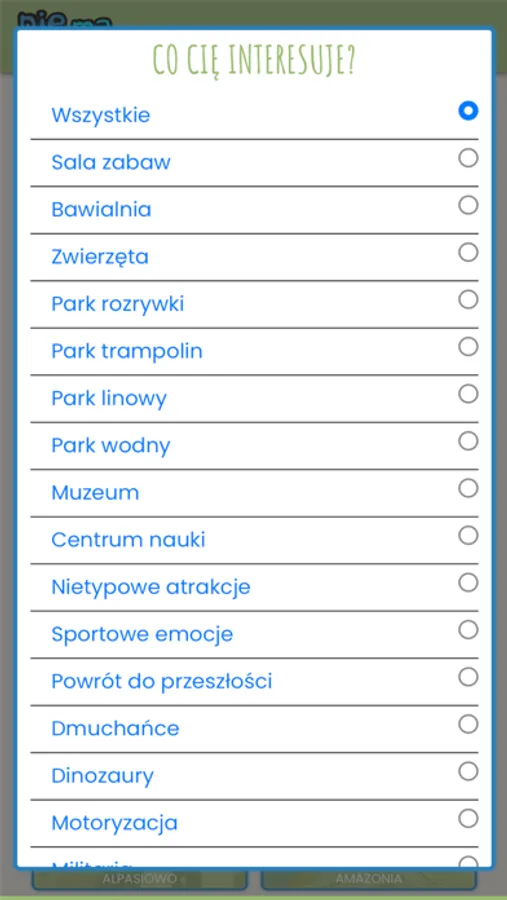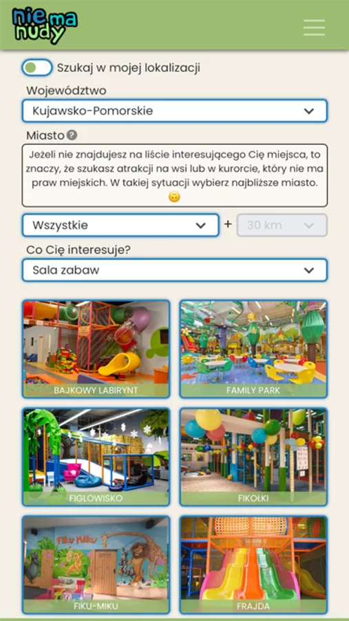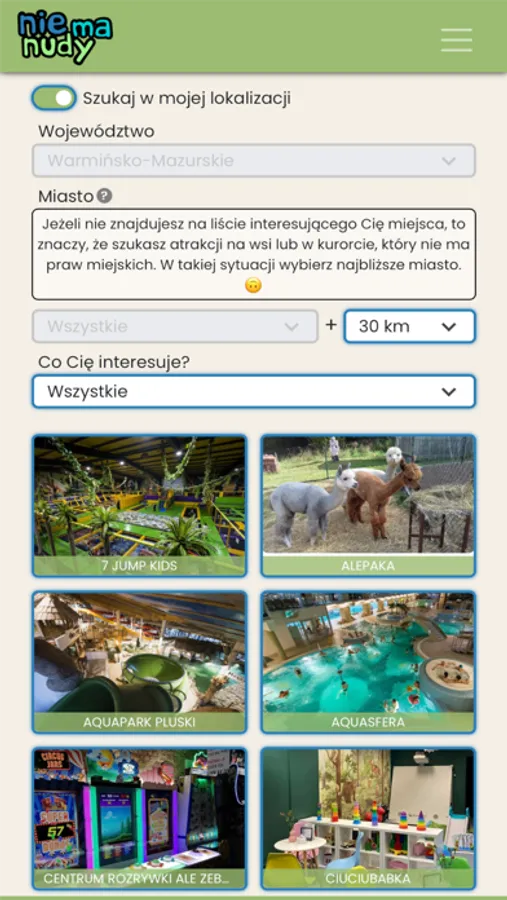 Skupiliśmy się na miejscach, które są przyjazne przede wszystkim dzieciom. Planujesz dłuższy wyjazd, szukasz pomysłu na weekendowy wypad, a może nie wiesz, co robić w pochmurny dzień we własnym mieście? Sprawdź nasze propozycje aquaparków, parków aktywności, interaktywnych muzeów, sal zabaw oraz bawialni, parków rozrywki, a także wielu innych ciekawych miejsc i obiektów, które zainteresują dzieci w każdym wieku. Lubisz dinozaury, militaria, zwierzęta, a może interesujesz się motoryzacją? Na każdego z Was czeka tu mnóstwo nowych, fascynujących miejsc do odkrycia.