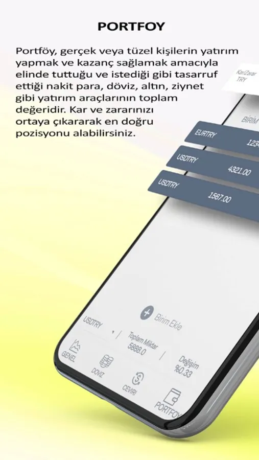 Portföy, gerçek veya tüzel kişilerin yatırım yapmak ve kazanç sağlamak amacıyla elinde tuttuğu ve istediği gibi tasarruf ettiği nakit para, döviz, altın, ziynet gibi yatırım araçlarının toplam değeridir. Kar ve zararınızı ortaya çıkararak en doğru pozisyonu alabilirsiniz.